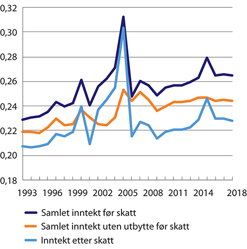 Figur 7.3 viser utviklingen i samlet inntekt før skatt med og uten utbytte og inntekt etter skatt over en lengre tidshorisont, 1993–2018. Figuren viser en betydelig variasjon i Gini-koeffisienten for inntekt før og etter skatt i årene rundt den midlertidige utbytteskatten i 2001, innføringen av ny utbytteskatt fra 2006 og økt skattesats på utbytte fra 2016. Særlig i årene før 2006 steg Gini-koeffisienten kraftig, mens den falt kraftig fra 2006. Disse endringene henger i stor grad sammen med tilpasninger knyttet til endringer i skattereglene som synliggjør inntekter i skattestatistikken. Særlig i forkant av innføringen av skatt på aksjeinntekter for personer (utbytte og realiserte gevinster) fra 2006 var det gunstig å ta ut kapital fra bedriftene som utbytte og tilbakeføre dette som innskutt kapital. Innskutt kapital kan senere tas ut uten å bli skattlagt på personens hånd. Slike transaksjoner vil i liten grad gi endringer i den reelle fordelingen, men har stor betydning for den målte fordelingen. Fordelingen av samlet inntekt uten utbytte før skatt viser betydelig mindre svingninger rundt de nevnte årene. Figuren indikerer at Gini-koeffisienten ikke gir et godt bilde på fordelingen for årene 2000–2006 og 2015.