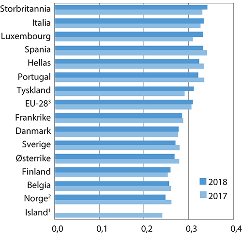 1 Eurostat har ikke publisert tall for Island 2018. I figuren er Gini-koeffisienten for 2016 lagt til grunn.