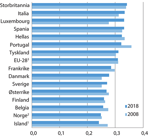 Figur 7.4 viser at inntektsulikheten slik Eurostat måler den, anslås å være noe lavere i Norge enn i Danmark og Sverige og betydelig lavere enn i EU-28. Gini-koeffisienten for Norge var på 0,248 i 2018, som er lavere enn nivået i 2008. Eurostat har estimert Gini-koeffisienten for EU-28 til 0,309 i 2018.