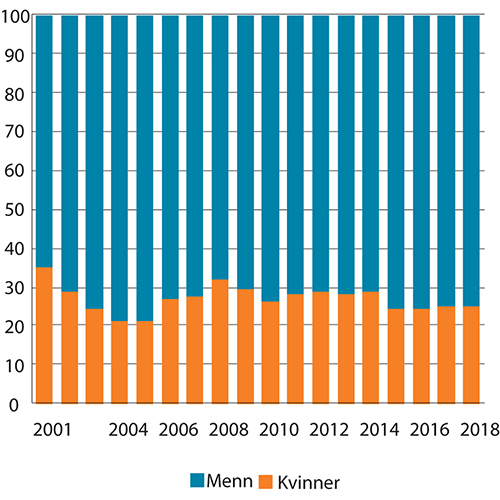 Figur 7.6 Prosentvis fordeling av brutto kapitalinntekter1 mellom kvinner og menn. 2001–2018. Populasjonen er definert som bosatte kvinner og menn 17 år og eldre