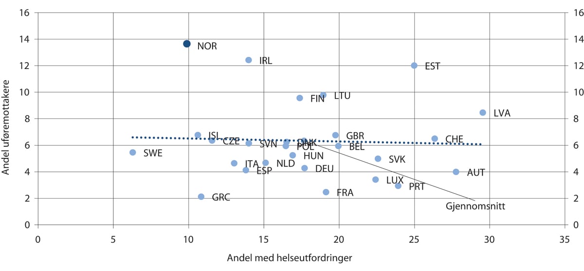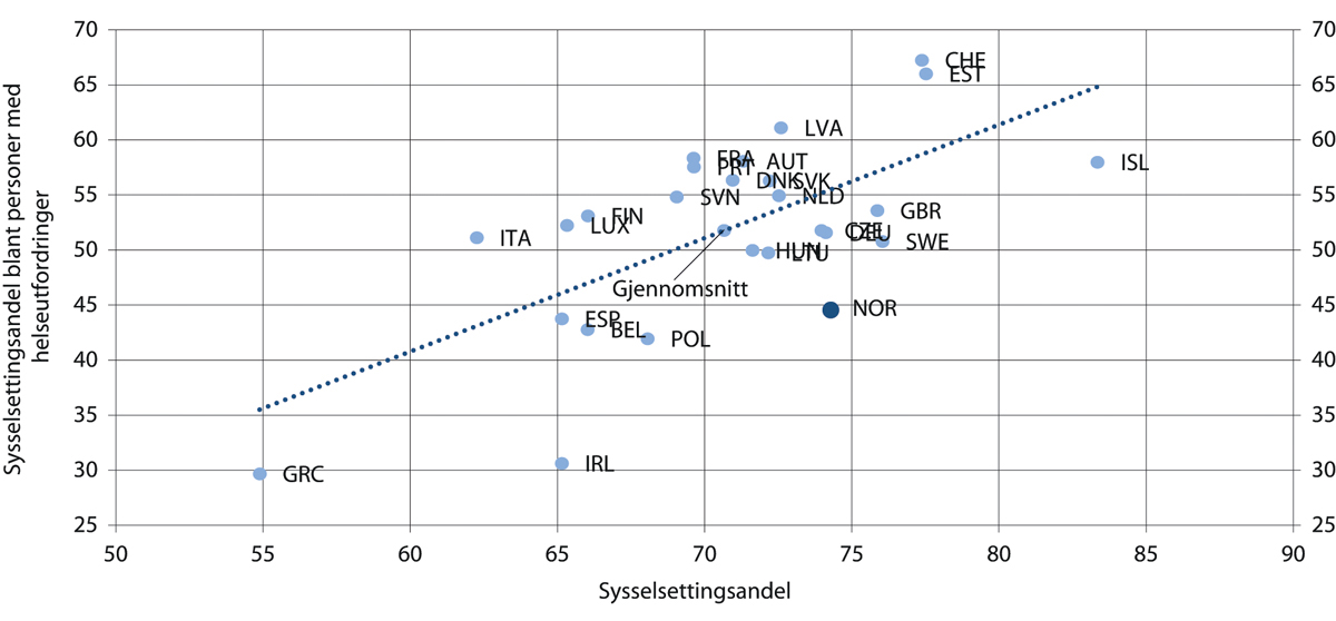 Høy uføreandel kan ha sammenheng med lav arbeidsledighet og høy deltakelse i arbeidslivet. Sysselsettingen blant personer med helseutfordringer synes imidlertid ikke å være spesielt høy i Norge, se boks 10.2. Tilsvarende problemstilling drøftes i kapittel 9 om sykefravær, med utgangspunkt i spørsmålet om det høye målte sykefraværet i Norge sammenlignet med andre land kan forklares med sammensetningseffekter. Det konkluderes der med at forskning ikke har klart å slå fast hvorvidt individer med særskilt høyt sykefravær i større grad kan være inkludert i arbeidsstyrken i Norge enn i andre land. Tilgjengelig statistikk tyder ikke på at personer med helseutfordringer i større grad er inkludert i arbeidslivet i Norge enn i andre europeiske land.