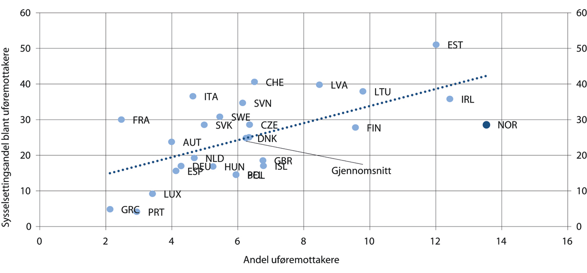 Sammenlignet med andre land er det en høy andel av den voksne befolkningen i Norge som mottar uføreytelser. I en rekke andre land er det en større andel som mottar andre ytelser, som sosialhjelp eller arbeidsledighetstrygd, eller som har svært lav eller ingen inntekt. Det er også flere som forsørges av familien, eller er på ulike førtidspensjoneringsordninger.