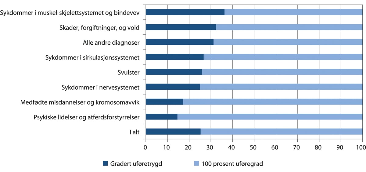Det store flertallet av uføretrygdede har 100 prosent uføretrygd og jobber ikke. Men det er også en del uføretrygdede som kombinerer trygd med betalt arbeid. Ved utgangen av 2019 var 18 prosent av alle mottakere av uføretrygd registrert i arbeid, se figur 10.10. Av de uføre med gradert uføretrygd var det 71 prosent som var i arbeid, mot om lag 5 prosent for de med 100 prosent uføregrad. Om lag 4 av 5 uføre i arbeid var innvilget en gradert uføretrygd.