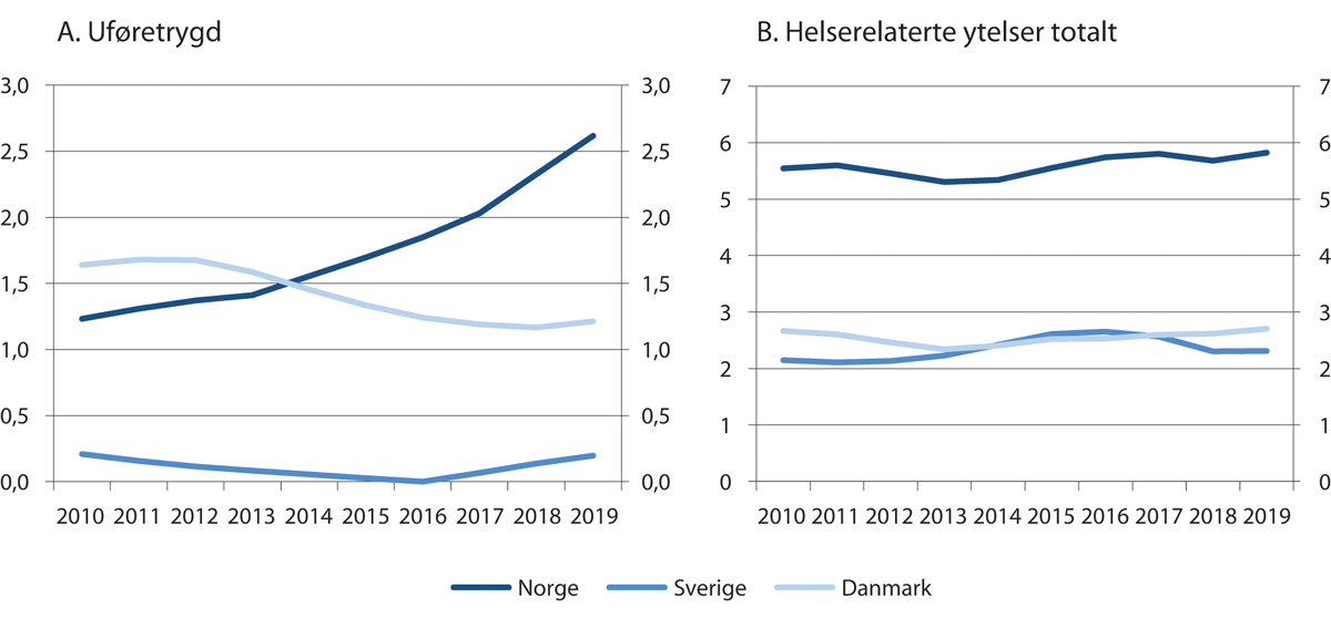 Panel A: Uføretrygd inkluderer mottakere av sjukersättning i Sverige og førtidspension i Danmark. Mellom 2003 og 2017 var det ikke adgang til å innvilge sjukersättning til personer under 30 år i Sverige. Inngangsvilkårene for førtidspension i Danmark for personer under 40 år ble strammet inn i 2013. Panel B: Helserelaterte ytelser viser mottakere av uføretrygd og arbeidsavklaringspenger i Norge, sjukersättning og aktivitetsersättning i Sverige og førtidspension, fleksjob, ressourceforløb, jobafklaringsforløb, revalideringsydelse og forrevalideringsydelse i Danmark.