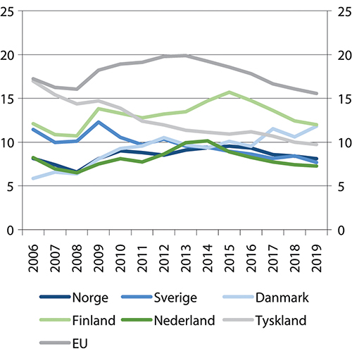 Figur 4.5 Arbeidsledigheten i Norge og utvalgte land, 20–64 år. Årsgjennomsnitt i prosent av arbeidsstyrken. 2006–2019