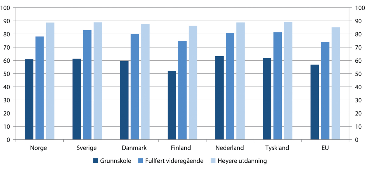 Sysselsettingen er markert lavere for de som har grunnskole som høyeste fullførte utdanning enn for grupper med mer utdanning. I Norge var 61 prosent av de med grunnskole som høyeste fullførte utdanning sysselsatt i 2019. Det er på nivå med Sverige, men noe lavere enn Tyskland og Nederland. I gjennomsnitt ligger sysselsettingen 20 prosentpoeng lavere for de med grunnskole enn for de med fullført videregående i landene i figur 4.14, i Norge ligger den 17 prosentpoeng lavere. De med fullført høyere utdanning har 28 prosentpoeng høyere sysselsetting i Norge enn de med kun grunnskole. Forskjellene henger også sammen med ulik aldersstruktur. De med kun grunnskole er i større grad i aldersgruppene 20–24 år og 55–64 år, hvor sysselsettingen er lav. Det ser likevel ut til at betydningen av fullført videregående utdanning har økt over tid i alle land. For Norges del har sysselsettingsandelen falt med 3,6 prosentpoeng for de med kun grunnskole siden 2006, mot 2,6 prosentpoeng for de med fullført videregående og uendret sysselsetting for de med høyere utdanning.