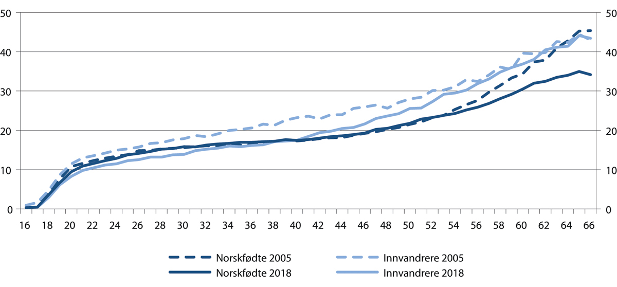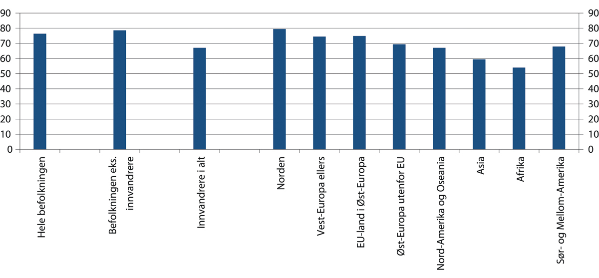 For bosatte uten innvandrerbakgrunn har sysselsettingsveksten vært høyere etter 2015 enn den var i årene før. Samtidig har befolkningsveksten avtatt. Det har ført til at andelen sysselsatte i denne gruppen økte fra 77,5 prosent i 2015 til 78,6 prosent i 2019 for aldersgruppen 20–66 år. For bosatte innvandrere har antallet sysselsatte og antallet i befolkningen økt omtrent like mye etter 2015. Det har bidratt til at sysselsettingsandelen har økt med over tre prosentpoeng for innvandrere, se også avsnitt 4.3.