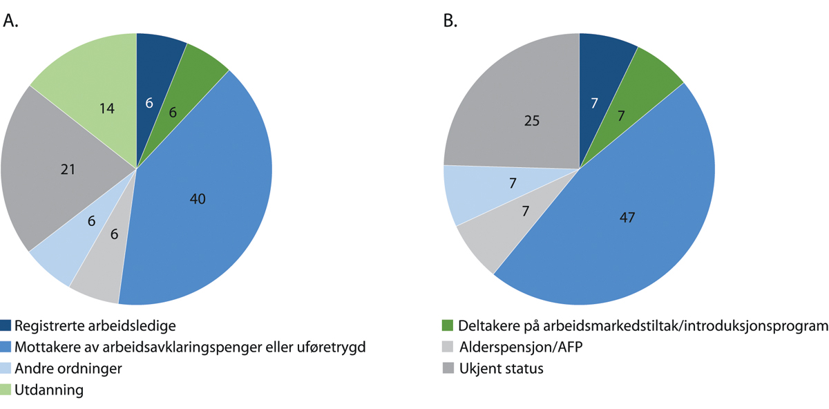 Utslagene pandemien har gitt på arbeidsmarkedet forsterker utfordringene vi står overfor. Alstadsæter m.fl. (2020) finner blant annet at personer med lav inntekt, kort utdanning, unge og innvandrere hadde større sannsynlighet for å bli permittert eller oppsagt i starten av krisen. Statistikk fra Statistisk sentralbyrå bekrefter dette. Den registrerte arbeidsledigheten økte med 3,6 prosentpoeng for innvandrere fra 1. til 3. kvartal 2020, mot 1,5 prosentpoeng for befolkningen uten innvandrerbakgrunn.2 Ledigheten blant kvinner fra nye EU-land i Øst-Europa økte særlig mye. Antallet som er i jobb, har også falt særlig mye for de under 25 år og de over 67 år. For de yngste skyldes det hovedsakelig færre nyansettelser, mens for den eldste gruppen skyldes det først og fremst at flere har avsluttet sine arbeidsforhold. Dette kapitlet viser at de som stod utenfor arbeidsmarkedet før krisen over tid ser ut til å ha blitt en mer marginalisert gruppe. Krisen innebærer at de må konkurrere med nye grupper av ledige om de ledige jobbene. Det vil kunne gjøre det vanskeligere å komme i jobb.