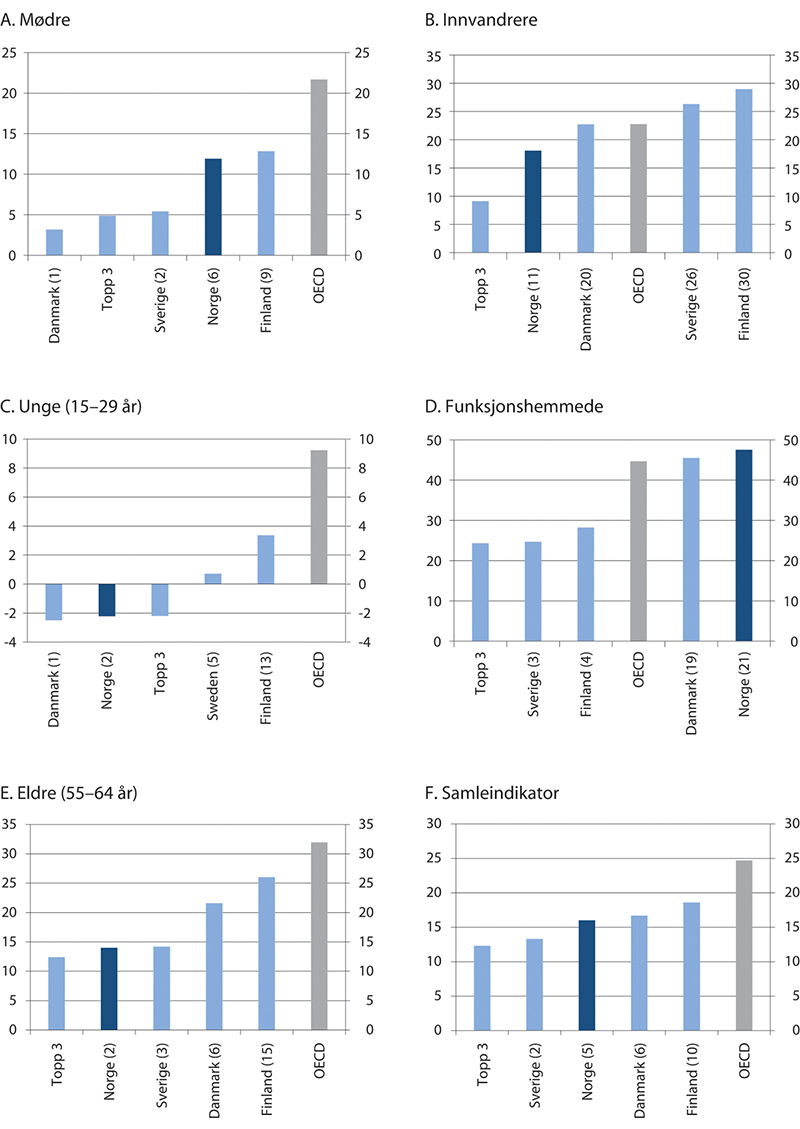 Den svakere sysselsettingsutviklingen i perioden 2006–2019 gjelder både kvinner og menn og alle tre aldersgruppene 20–24 år, 25–54 år og 55–64 år. Nedgangen i sysselsettingen blant unge i Norge skyldes i stor grad at flere tar mer utdanning, og at færre kombinerer utdanning og arbeid. NEET-raten har holdt seg stabil i Norge, og er lav sammenlignet med de fleste andre land. Tall fra OECD og arbeidskraftsundersøkelsen i Norge kan tyde på et betydelig potensial for å øke sysselsettingen blant funksjonshemmede, og flere innvandrergrupper har lav sysselsetting.