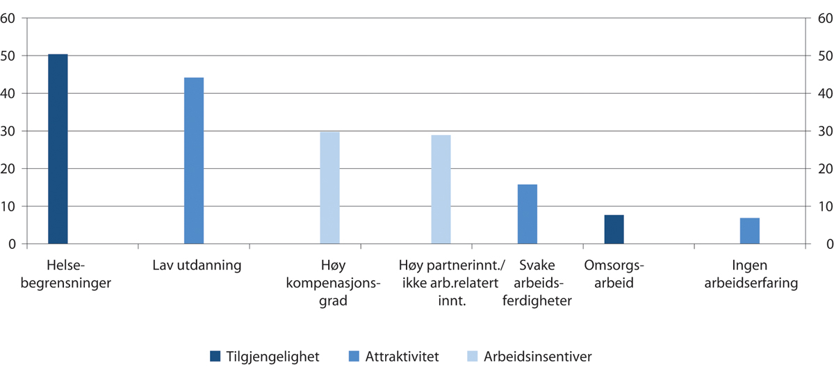 Flere analyser tyder på at det å ha fullført videregående opplæring blir viktigere for deltakelse på arbeidsmarkedet. Det er også tegn til at de som ikke er i jobb gjennomgående er lenger unna arbeidslivet enn de var tidligere, blant annet ved at færre har vært i jobb. På kort sikt endrer riktignok koronakrisen dette bildet noe, ved at flere av de arbeidsledige nylig har vært i arbeid. Andelen av de ikke-sysselsatte som er arbeidssøkere falt utover 1990-tallet og fram til 2004/05, mens andelen som er registrert med nedsatt arbeidsevne økte. Blant unge har vridningen fra arbeidsledighet til nedsatt arbeidsevne fortsatt. Mange av de som er utenfor, opplever flere ulike barrierer for å komme i jobb, både helseproblemer, kompetanseproblemer og for en del også svake økonomiske insentiver. Økonomiske insentiver kan både knytte seg til høy inntekt i husholdningen eller at potensiell arbeidsinntekt er lav målt mot trygdeytelser, for eksempel om man kun har mulighet til deltidsjobb i et lavlønnsyrke. At mange møter flere typer barrierer betyr også at det er viktig å få til et bedre samarbeid mellom ulike offentlige tjenester, for eksempel mellom NAV, helsesektoren og utdanningssektoren.