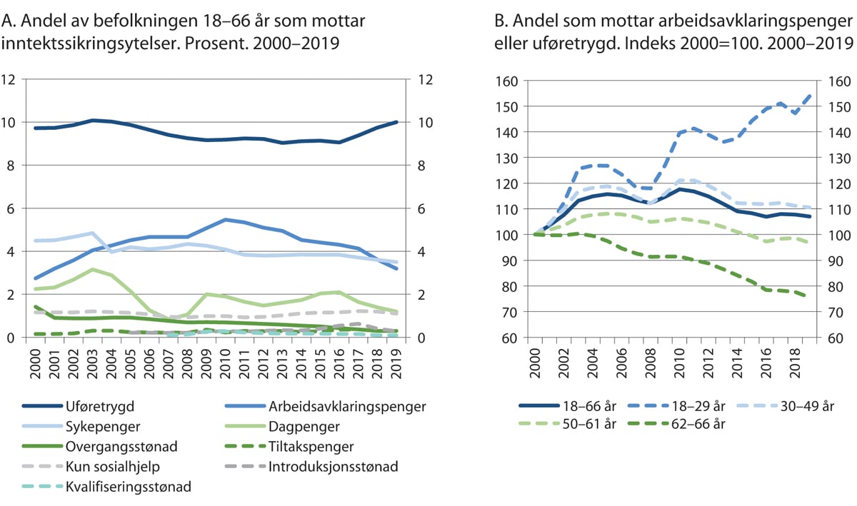 Norge har vært i en særstilling når det kommer til offentlige finanser de senere årene. Veksten i underliggende skatteinntekter har vært god, og oljepengebruken økte med i gjennomsnitt 15 mrd. kroner per år i budsjettene fra 2014–2019. Koronapandemien har illustrert betydningen av gode offentlige finanser. Norge hadde betydelig handlingsrom til å iverksette midlertidige krisetiltak da pandemien inntraff. Økt oljepengebruk under koronapandemien innebærer imidlertid isolert sett at budsjettene blir trangere framover enn lagt til grunn før utbruddet. I årene framover forventes det at veksten i underliggende skatteinntekter avtar som følge av lavere befolkningsvekst og aldring av befolkningen. Innfasingen av oljepengebruk vil være betydelig lavere framover, som følge av at inntektene fra olje- og gassvirksomheten etter hvert vil avta. Samtidig vil aldringen av befolkningen øke utgiftene til alderspensjon og helse- og omsorgstjenester. På lengre sikt vil lavere inntekter og høyere utgifter føre til et inndekningsbehov i offentlige finanser. Det vil også gjøre det vanskeligere å prioritere økte ressurser til oppfølging og tiltak av personer utenfor arbeid, noe som vil gjøre det enda viktigere for arbeidsmarkeds-, utdannings- og integreringssektoren å jobbe effektivt og prioritere samfunnsøkonomisk lønnsomme tiltak.