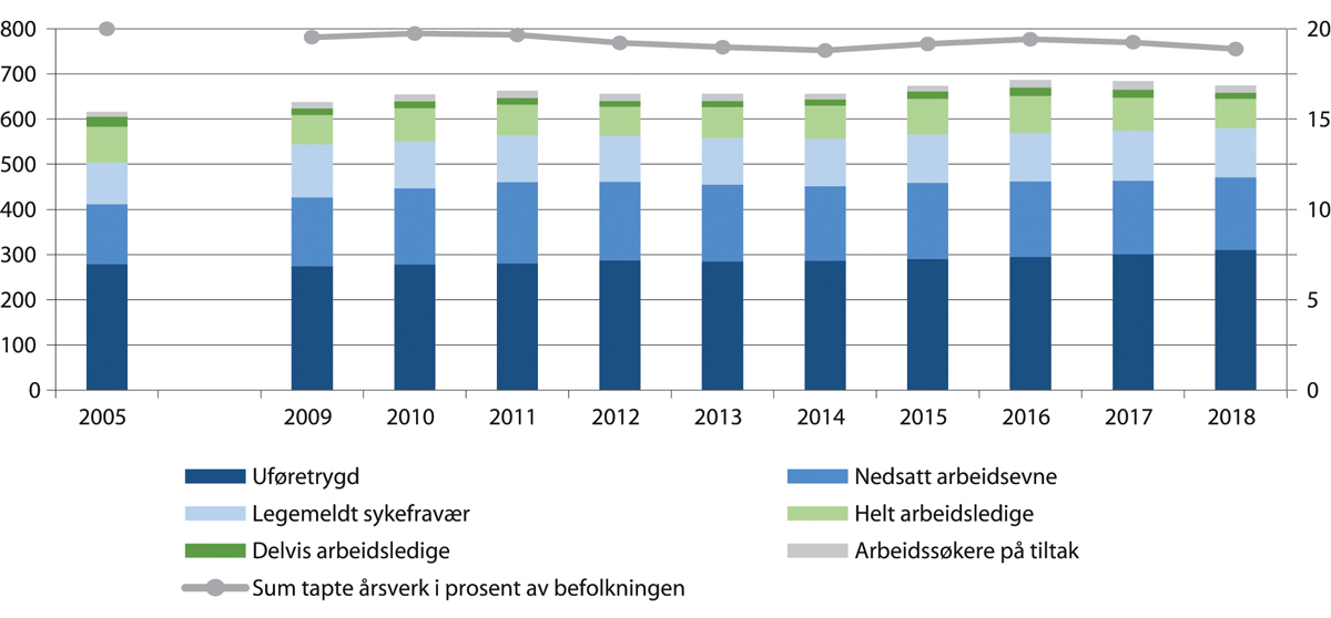 Til tross for at i overkant av 260 000 jobber blir borte per år, har arbeidsledigheten holdt seg lav og gått noe ned fram til koronakrisen inntraff, mens andelen sysselsatte har gått noe opp. Det er også tilfellet om vi ser lengre tilbake i tid. Det norske arbeidslivet har over tid gått gjennom store omstillinger, blant annet ved at en stadig større andel av jobbene er i tjenestesektoren. Det har i det store og hele gått sammen med lav arbeidsledighet og høy sysselsetting. Det er likevel vist at bedriftsnedleggelser og nedbemanninger øker sannsynligheten for å bli uføretrygdet (se for eksempel Rege m.fl. 2009). Vi har også store omstillinger foran oss, blant annet på grunn av ettervirkninger fra koronapandemien, lavere forventet aktivitet i petroleumsindustrien, grønn omstilling og økt behov innenfor helse, pleie og omsorg (se avsnitt 4.5). Det er viktig at vi også framover klarer å håndtere store omstillinger og samtidig holde sysselsettingen høy. Den norske modellen har vist seg robust i møte med endringer, og er et godt utgangspunkt for å legge til rette for nødvendig omstilling framover, se nærmere omtale i kapittel 3.