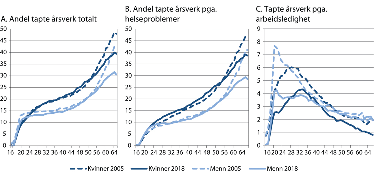 Aldringen vil gi større reduksjon i sysselsettingen som andel av hele befolkningen. Figur 4.28 B viser at fallet i sysselsettingen som andel av hele befolkningen vil utgjøre 3,2 prosentpoeng mellom 2019 og 2040 dersom sysselsettingsandelen i ulike aldersgrupper holdes konstant. Nedgangen i sysselsettingen vil bli mindre enn figuren viser dersom sysselsettingen blant eldre fortsetter å øke. Det påvirkes blant annet av situasjonen på arbeidsmarkedet, virkninger av pensjonsreformen og utviklingen i helsetilstanden blant eldre. Dersom ledigheten i forbindelse med koronapandemien holder seg høy over tid er det en risiko for at eldre arbeidstakere går ut av arbeidslivet tidligere enn det som var ventet før pandemien. Det er derfor viktig med tiltak for å øke sysselsettingen blant seniorer og eldre. Det er nærmere omtalt i kapittel 12.