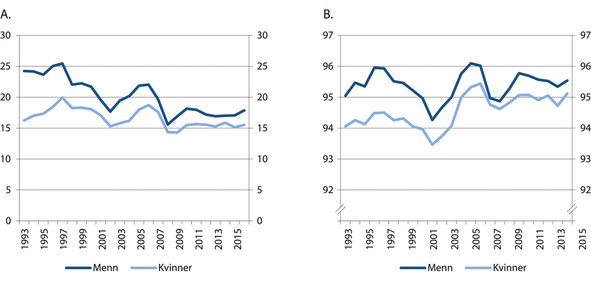 Med økende levealder er det viktig at flere jobber lenger. Andelen som jobber i alderen 65–69 år har økt i alle landene i figur 4.4 (panel B), selv om nivået er vesentlig lavere enn i aldersgruppen 20–64 år. Økningen er størst i Sverige og Tyskland, men nivået er fortsatt høyest i Norge. Erfaringsmessig vil sysselsettingen i denne gruppen gå ned i en situasjon med svært høy ledighet, og det ser også ut til å være tilfellet i koronakrisen. I resten av kapitlet fokuseres det på aldersgruppen 20–64 år, mens kapittel 12 drøfter tiltak for å øke sysselsettingen for seniorer.