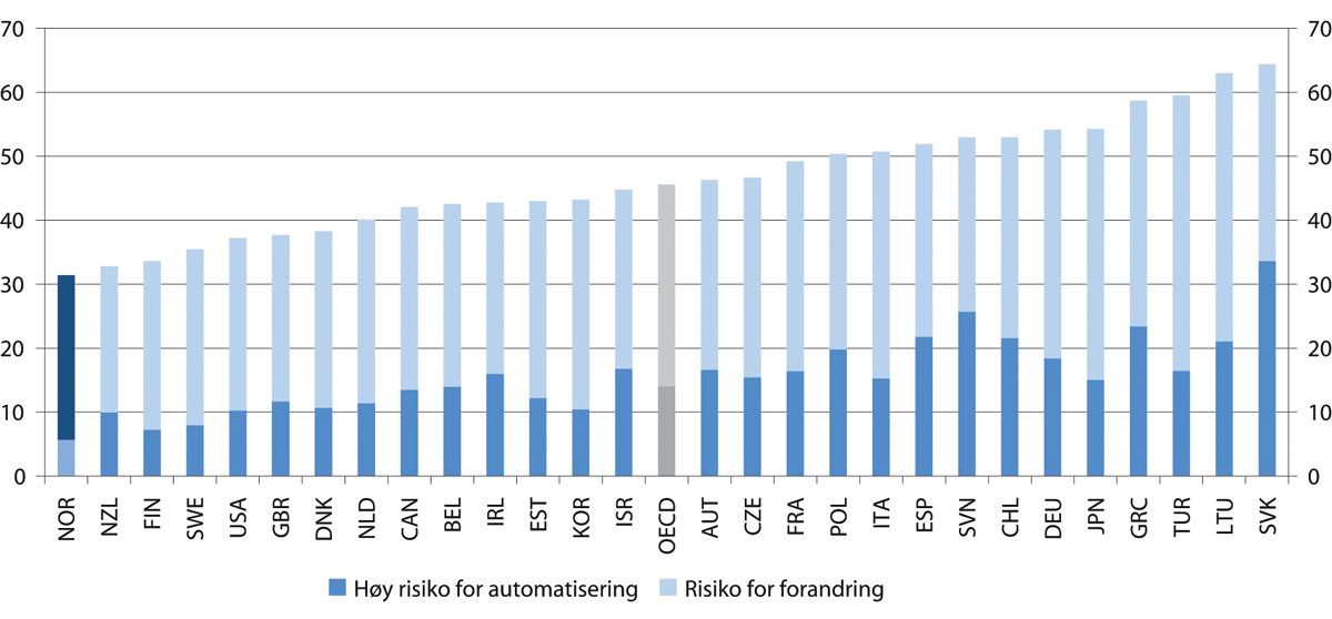 OECD anslår at om lag 14 prosent av eksisterende jobber i OECD-land har høy risiko for å bli automatisert som følge av ny teknologi. For Norges del gjelder det kun 6 prosent, som er lavest av alle OECD-land. Samtidig anslår OECD at om lag en tredel av eksisterende jobber i Norge kan bli endret betydelig som følge av ny teknologi. Det er også lavest blant OECD-landene. Grunnen til den relative plasseringen er at Norge allerede ligger høyest når det gjelder bruk av informasjonsteknologi og har lavest andel rutinebaserte jobber (Nedelkoska og Quintini 2018). Disse anslagene er naturligvis usikre, og OECD understreker at landene uansett bør være forberedt på betydelige endringer i arbeidsmarkedet framover.