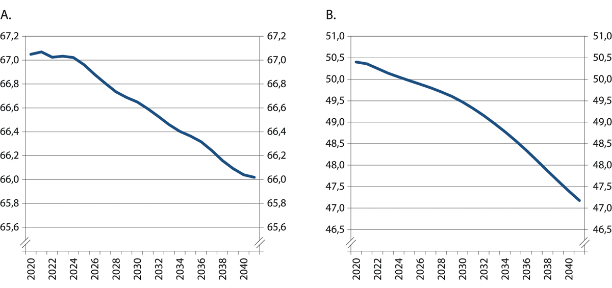 Økningen i antall eldre betyr at det blir stadig mer krevende å holde arbeidsstyrken og sysselsettingen høy som andel av befolkningen. I perioden 2000–2017 har aldringen i befolkningen isolert sett trukket sysselsettingsandelen i alderen 16–74 år ned med 1,9 prosentpoeng (NOU 2019: 7). Også framover vil aldringen isolert sett bidra til lavere sysselsettingsandel, men mindre enn i perioden 2000–2017. Figur 4.28 A viser at dersom sysselsettingsandelen i ulike aldersgrupper holdes konstant på nivået fra 4. kvartal 2019, vil sysselsettingsandelen isolert sett falle med i underkant av 0,5 prosentpoeng fra 2019 til 2030, og med 1 prosentpoeng mellom 2019 og 2040.11
