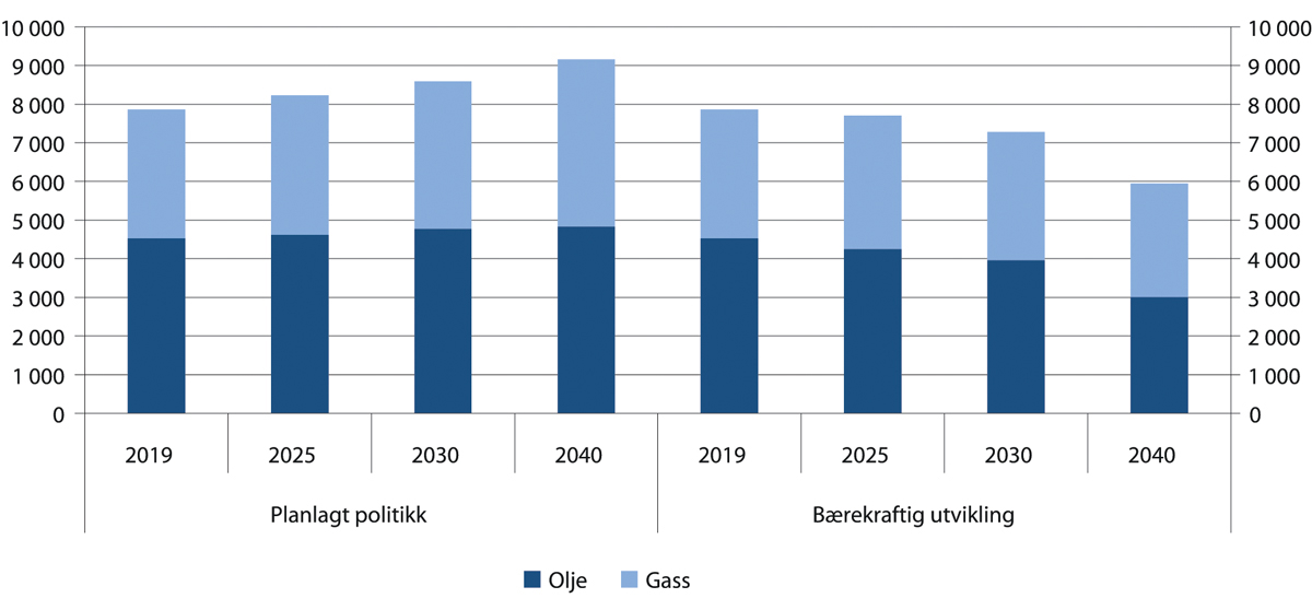For å nå klimamålene kreves det tiltak som trolig vil redusere etterspørsel etter norsk olje og gass. En slik utvikling kan bidra til å framskynde nedbyggingen av petroleumssektoren, og øke utfordringene knyttet til omstillingen av norsk økonomi. I Paris-avtalen fra 2015 ble de fleste landene i verden enige om å begrense temperaturstigningen til under 2 grader, og helst under 1,5 grader sammenlignet med førindustriell tid. Ifølge International Energy Agency (IEA) vil etterspørselen etter olje og gass øke fram mot 2040 dersom planlagt politikk legges til grunn. Samtidig vil ikke verden nå klimamålene. IEA har imidlertid laget et scenario som viser hvilke tiltak som er nødvendige for å nå Paris-avtalens klimamål. I dette scenariet vil etterspørselen olje og gass være henholdsvis 34 og 12 prosent lavere i 2040 enn i 2019 (International Energy Agency 2020).