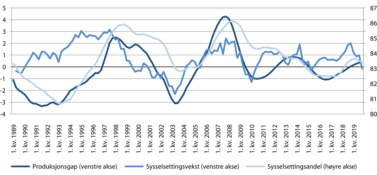 Mellom 2000 og februar 2020 har tre nedgangskonjunkturer bidratt til å dra ned etterspørselen, mens de to oppgangskonjunkturene etter finanskrisen har vært moderate. Figur 4.8 viser utviklingen i produksjonsgap og sysselsettingsrate for aldersgruppen 25–54 år fra 1989 til 2019. Produksjonsgapet er beregnet av Statistisk sentralbyrå, og viser hvordan kapasitetsutnyttingen i økonomien er sammenlignet med et anslått normalt nivå. Når grafen stiger er det oppgangskonjunktur, og verdier over null indikerer at vi er i en høykonjunktur. Motsatt innebærer fallende graf nedgangskonjunktur og verdier under null lavkonjunktur. Figuren viser at sysselsettingsraten har fulgt konjunkturutviklingen tett, og ofte snudd ganske raskt når konjunkturene snur.