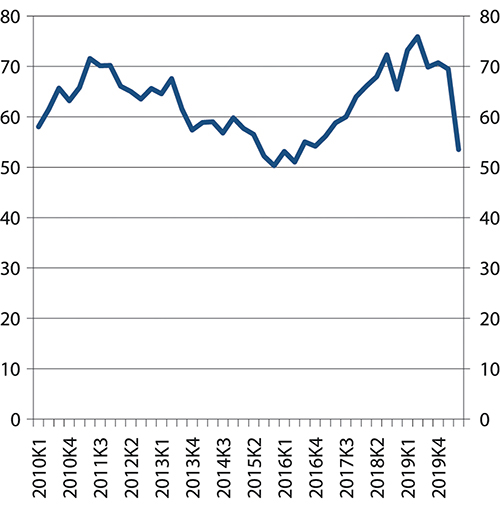 En viktig indikator for utviklingen i etterspørselen etter arbeidskraft er antallet ledige stillinger. Også denne indikatoren viser svak utvikling i årene 2011–2014, hvor antallet ledige stillinger begynte å falle et par år før konjunkturene snudde, se figur 4.9. Fra starten av 2016 og fram til sommeren 2019 var det en jevn stigning i antallet ledige stillinger. I 2019 var det i gjennomsnitt 72 000 ledige stillinger hvert kvartal. 2020 vil naturlig nok bli sterkt preget av koronakrisen. Tall for 2. kvartal viser et fall på 23 prosent i antallet ledige stillinger sammenlignet med 1. kvartal, og at krisen rammet de fleste næringene.