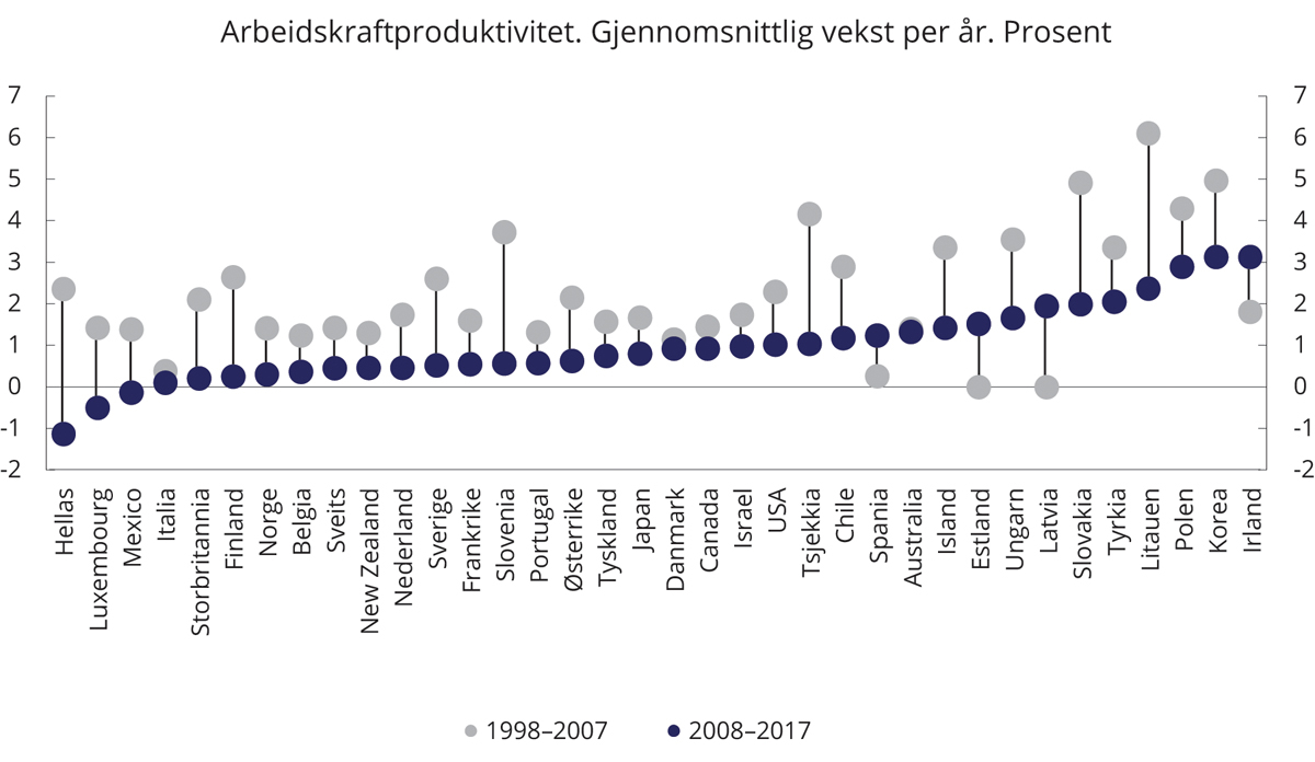 OECD (2020) har vært opptatt av å kartlegge hvorfor produktivitetsveksten har falt betydelig i de aller fleste OECD-land de siste årtiene, og hva som kan gjøres for å øke veksten. Figur 9.1 viser at de aller fleste land har hatt lavere produktivitetsvekst i perioden 2008–2017 enn i perioden 1998–2007.