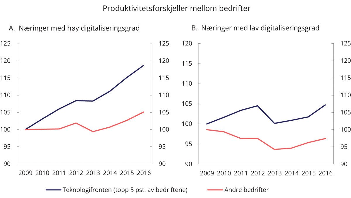 Tall fra OECD viser at ulikhetene i produktivitetsveksten mellom bedriftene har økt, se figur 9.2.