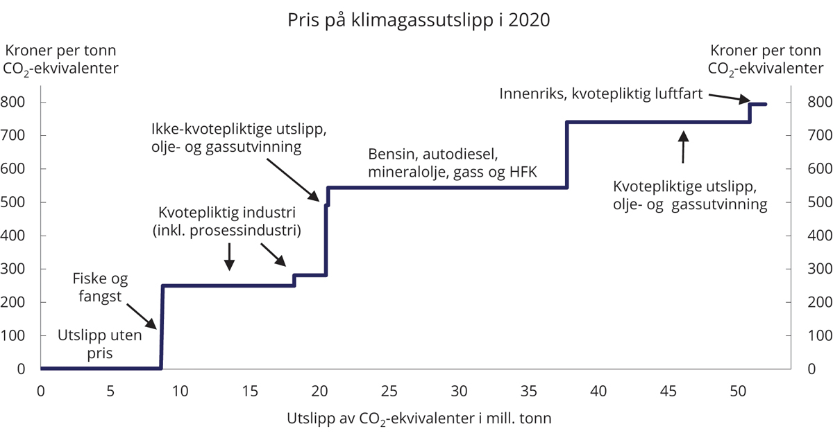 I dag omfattes over 80 pst. av klimagassutslippene i Norge av CO2-avgift og/eller av kvotesystemet. Dermed er det satt en pris på hoveddelen av norske klimagassutslipp. Figur 8.1 viser CO2-pris for ulike sektorer i Norge i 2020. Av figuren fremgår det at dagens virkemidler med CO2-avgift og deltakelse i kvotesystemet fører til at aktørene står overfor svært ulik pris på utslipp. Dermed kan ikke prisen reflektere den samfunnsøkonomiske kostnaden ved klimagassutslipp i alle sektorer. Ulik pris på utslipp fra ulike kilder eller sektorer fører til at ikke alle utslippsreduksjoner finner sted der de er billigst å gjennomføre. Utslipp fra olje og gass er underlagt både kvotesystemet og norsk CO2-avgift. Samlet pris er i februar 2021 på rundt 900 kroner per tonn CO2.