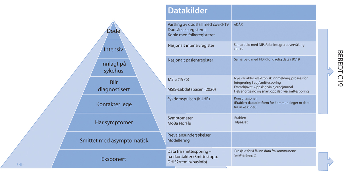 Overvåking, varsling, rapportering og diagnostikk, testing og smitteoppsporing er avgjørende både for det forebyggende arbeidet og for å dimensjonere kapasitet i helsetjenesten. Vesentlige innsatsfaktorer for behandling er legemidler, medisinsk utstyr og tilstrekkelig intensivkapasitet, gode smittevernrutiner og lokaler som kan håndtere smitte.