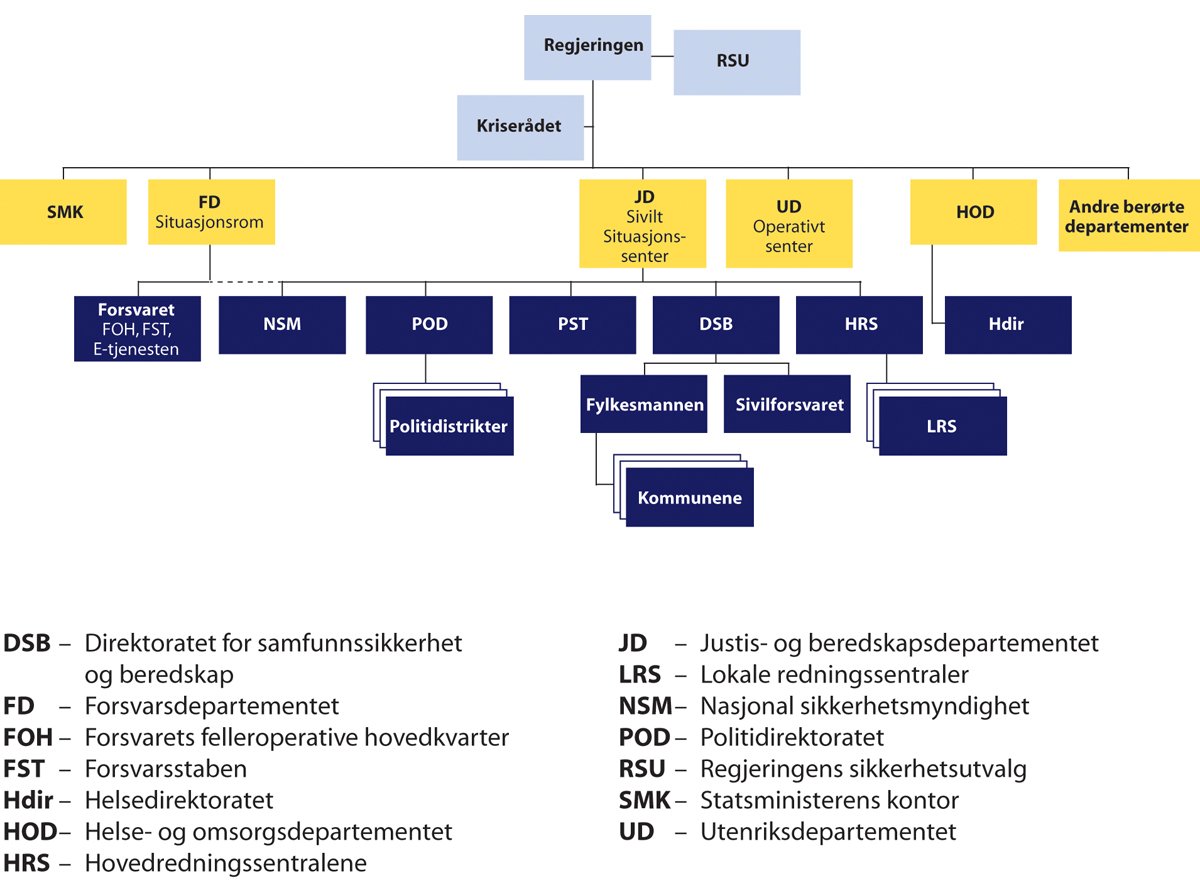 Regjeringen har det øverste ansvaret for å håndtere nasjonale kriser, herunder det overordnete politiske ansvaret for både styringen og håndteringen av kriser som oppstår.