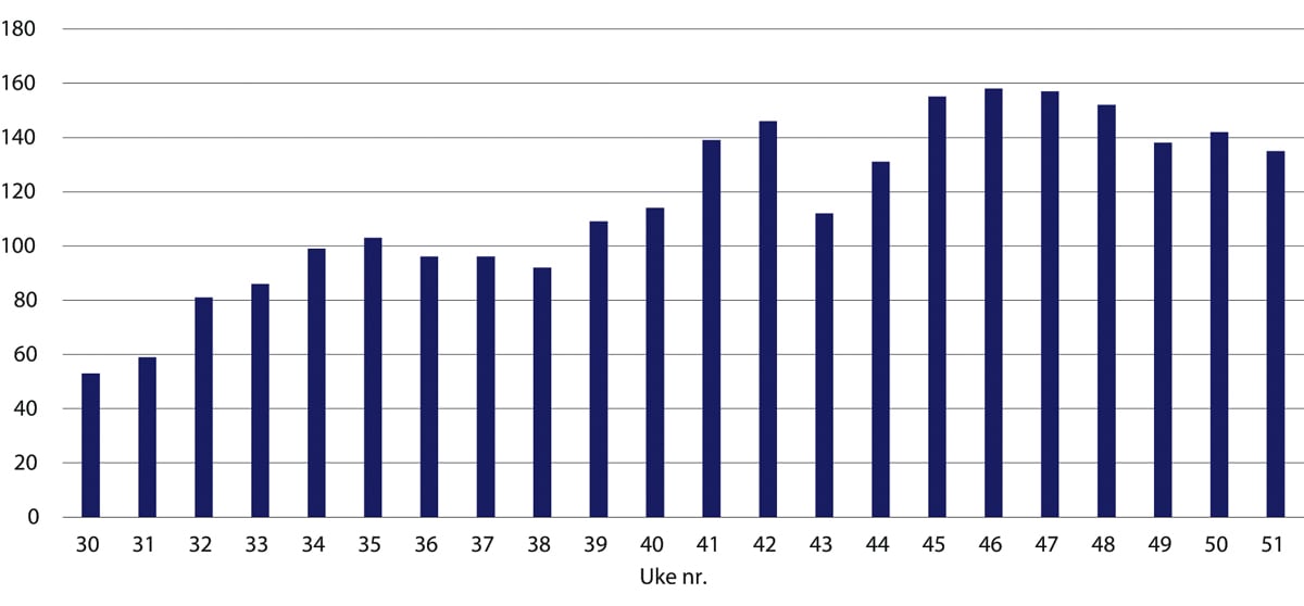Justis- og beredskapsdepartementet har opplyst at man gikk over til ukentlige rapporteringer i uke 15.