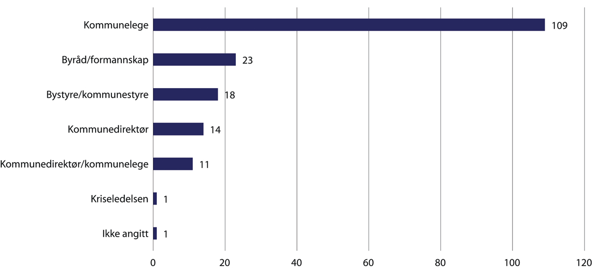Det framgår av smittevernloven at kommunelegen kan fatte vedtak i «hastesaker».22 Det betyr at dersom kommunestyret ikke rekker å samle seg for å fatte formelt vedtak, kan kommunelegen gjøre det. Forarbeidene beskriver at det ofte vil være aktuelt:23