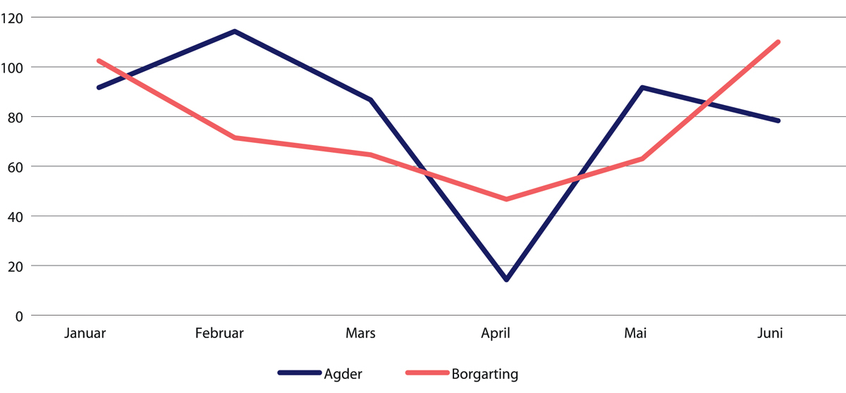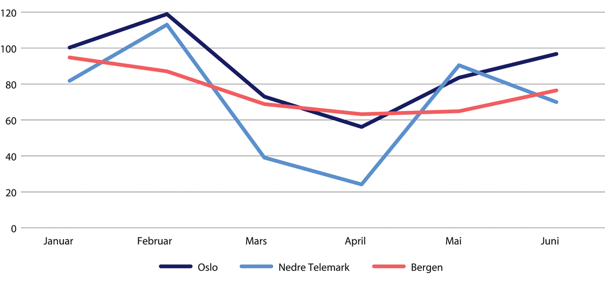 Det kom betydelig færre bekymringsmeldinger enn normalt til barnevernet i løpet av våren 2020 (Skrove mfl. 2021). I april 2020 fikk nesten halvparten av barnevernstjenestene i Norge færre bekymringsmeldinger enn vanlig. Samlet sett for perioden 1. mars til 1. mai 2020 var det omtrent tusen færre bekymringsmeldinger sammenliknet med året før.21 Antallet bekymringsmeldinger fra privatpersoner økte, mens antallet bekymringsmeldinger fra lærere, barnehager og skolehelsetjeneste sank betydelig.