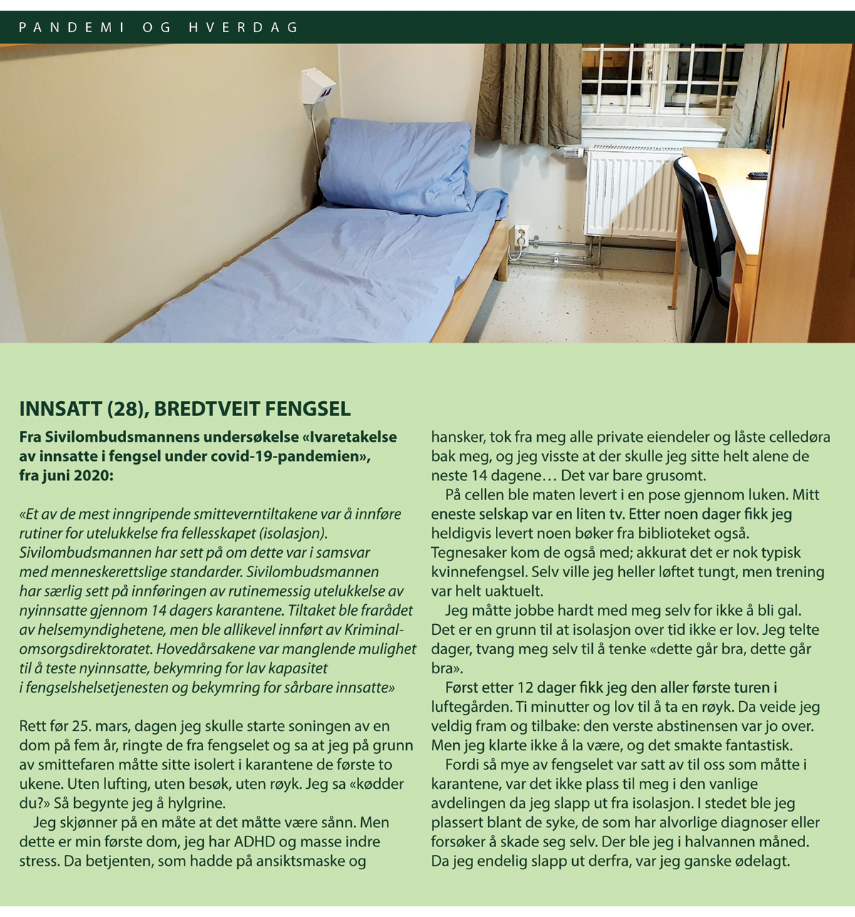 Etter straffegjennomføringsloven § 17 er det rettslige utgangspunktet at den innsatte så langt det er praktisk mulig, skal ha adgang til fellesskap under arbeid, opplæring, program eller andre tiltak og i fritiden. For utførlig gjennomgang av vilkår, bruk og skadevirkninger av isolasjon, vises det til Sivilombudsmannens særskilte melding til Stortinget om isolasjon og mangel på menneskelig kontakt i norske fengsler, Dokument 4:3 (2018/19). Her benyttes begrepet isolasjon som «situasjoner hvor innsatte er innelåst på en celle store deler av døgnet, på grunn av sikkerhets- eller kontrollhensyn, etter eget ønske, eller på grunn av bygnings- og bemanningsmessige eller andre forhold i fengselet».