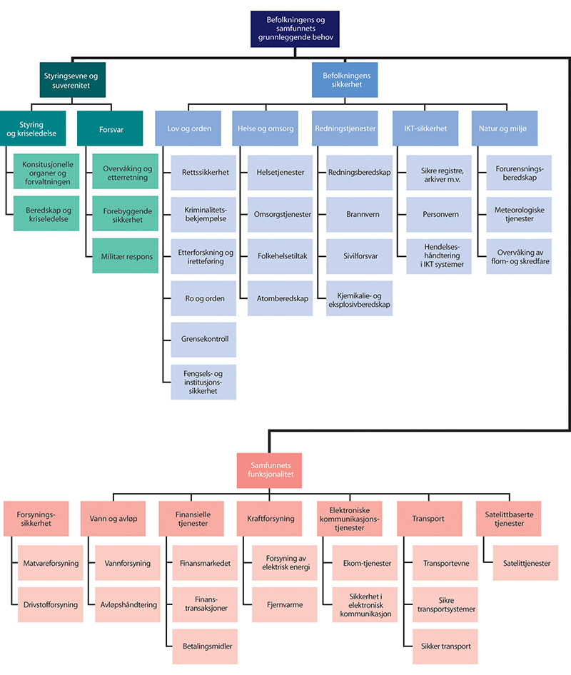 I Instruks for departementenes arbeid med samfunnssikkerhet (samfunnssikkerhetsinstruksen) heter det at Justis- og beredskapsdepartementet har ansvaret for å «utvikle og vedlikeholde oversikt over hvilke funksjoner som i et tverrsektorielt perspektiv er kritiske for samfunnssikkerheten». Med dette som utgangspunkt har Direktoratet for samfunnssikkerhet og beredskap (DSB) definert en liste over 14 kritiske samfunnsfunksjoner og hva som inngår i dem, jf. rapporten Samfunnets kritiske funksjoner fra 2016.2 På side 8 i rapporten går det fram at formålet med listen