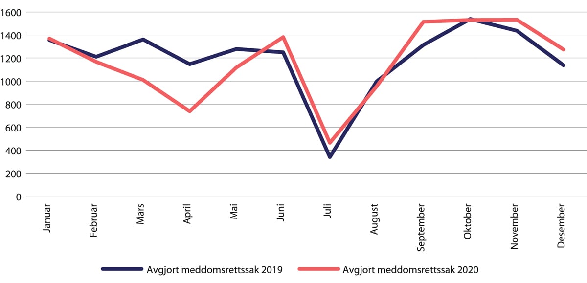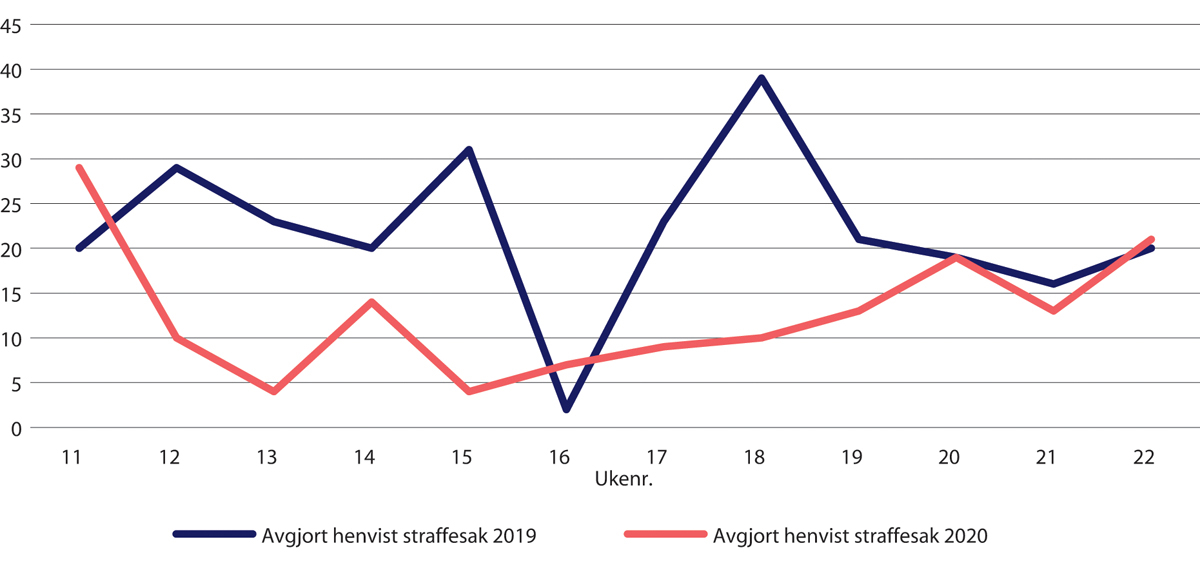 Ifølge årsmeldingen for 2020 var det to straffesaker som ble behandlet skriftlig.