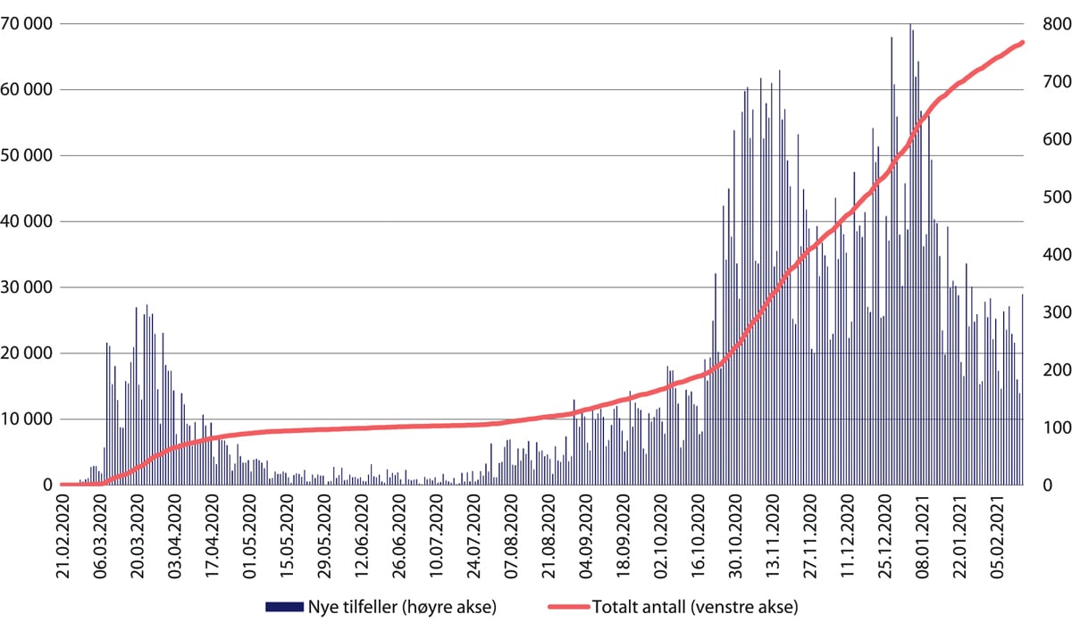 Figur 33.1 Registrerte covid-19-smittete i Norge. Totalt antall og antall nye tilfeller daglig. Status per 15. februar 2021.