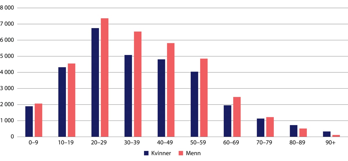 I midten av februar 2021 var i overkant av 67 000 personer registrert smittet med covid-19. Det var flest smittetilfeller i aldersgruppen mellom 20 og 29 år, og det var noen flere menn enn kvinner blant bekreftete smittetilfeller i de fleste aldergrupper (figur 33.2).