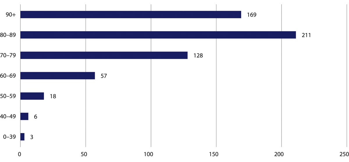 Per 15. februar 2021 var det registrert 592 dødsfall som følge av covid-19 i Norge.2 For de fleste dødsfallene ble det registrert en eller flere kroniske sykdommer på dødsmeldingen, hvorav hjerte- og karsykdom forekom hyppigst. Nesten ni av ti som døde var over 70 år (figur 33.3). I et normalår skjer drøyt halvparten av alle dødsfall i Norge i sykehjem. Foreløpige tall fra 2020 tyder på at i underkant av halvparten av covid-19-relaterte dødsfall skjedde i sykehjem. En tredel av de smittete i sykehjem døde. Sett i forhold til det totale antallet beboere i norske sykehjem, ble tre prosent av norske sykehjemsbeboere smittet i 2020. En prosent av sykehjemsbeboerne døde av covid-19 (Jacobsen mfl. 2021). Noen få institusjoner sto for en stor andel av de covid-19-relaterte dødsfallene (Barstad 2020).