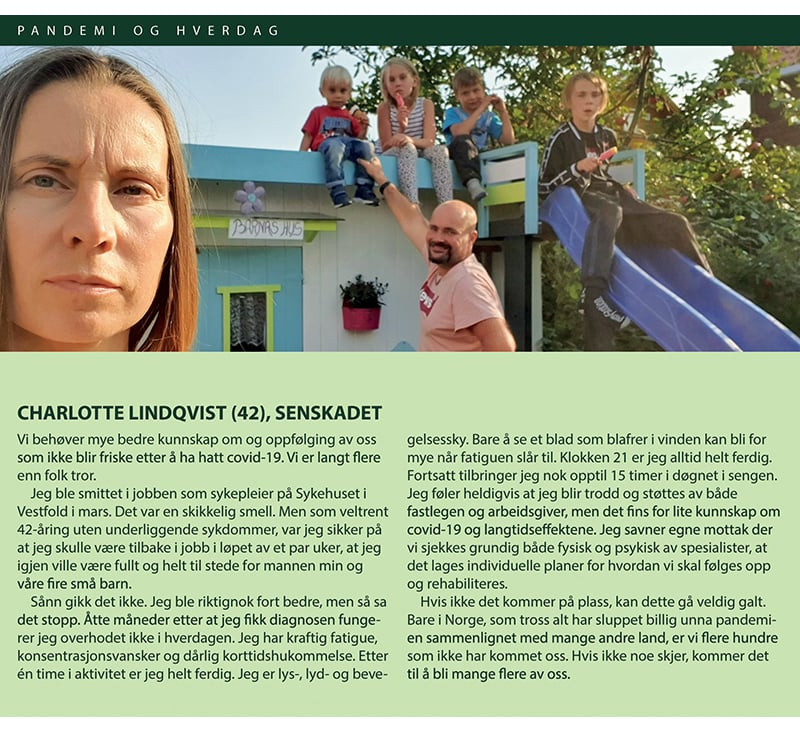 I en artikkel i Tidsskrift for den norske legeforening har Lindholm og Tønnessen (2020) oppsummert hva som så langt er kjent om langtidseffekter etter gjennomgått covid-19. De alvorlige forløpene som krever sykehusinnleggelse og behandling i intensivavdeling, var preget av dysfunksjon i vitale organsystemer, først og fremst lunger (se for eksempel Wiersinga mfl. 2020, Helms mfl. 2020, Klok mfl. 2020). Mange covid-19-pasienter vil ha behov for langvarig, tverrfaglig og koordinert rehabiliteringsforløp etter akuttfasen (Becker mfl. 2020).