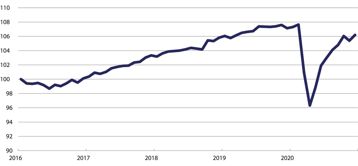 Sysselsettingen falt markert som følge av pandemien og smitteverntiltakene. Fra første til andre kvartal 2020 ble antall i jobb redusert med 76 000 personer ifølge kvartalsvis nasjonalregnskap. Sysselsettingen økte noe igjen utover høsten, men i fjerde kvartal 2020 var det likevel 50 000 færre i jobb enn ett år tidligere. Det tilsvarer en nedgang i sysselsettingen på 1,8 prosent. Til sammenlikning falt sysselsettingen med 1,3 prosent i Sverige og 0,6 prosent i Danmark i samme periode (Bougroug mfl. 2021).