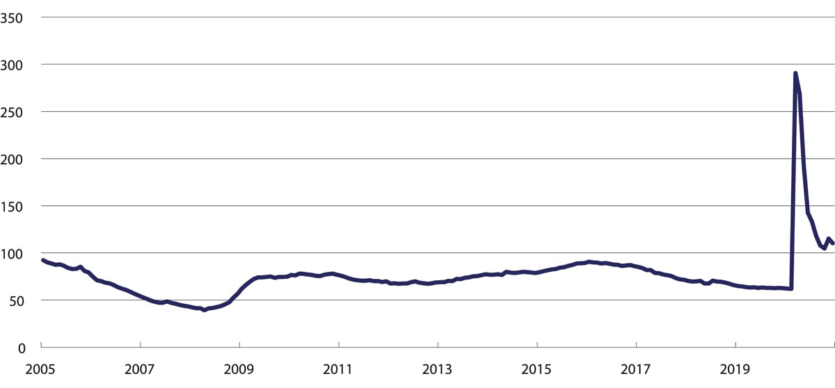Da verdiskapingen falt brått i mars 2020, var det betydelig frykt for konkurser.33 Foreløpig har det ikke vært noen økning i antall konkurser.