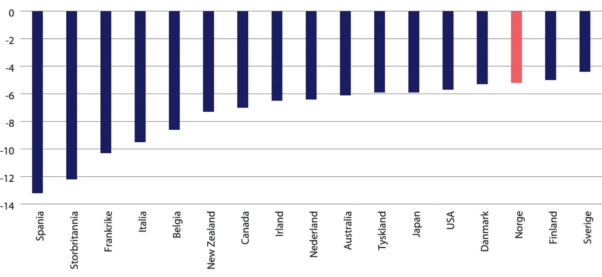 Tallgrunnlaget er et annet i dette delkapitlet enn i det foregående. Siden nasjonalregnskap ikke foreligger for alle land, har vi i dette delkapitlet for sammenlikningens skyld brukt OECDs anslag fra desember 2020, også for de skandinaviske landene, der regnskapsdata foreligger. Sammenlikningen mellom skandinaviske land i det foregående delkapitlet er basert på Bougroug mfl.(2021), som ser på avvik mellom regnskapsdata for BNP og prognoser ved utgangen av 2019 fra de respektive landenes sentralbanker og Consensus forecasts. Selv om de ulike tilnærmingene gir litt ulike tallanslag, indikerer begge at Sverige ser ut til å være noe mindre rammet økonomisk enn Danmark og Norge, men at forskjellen er liten.