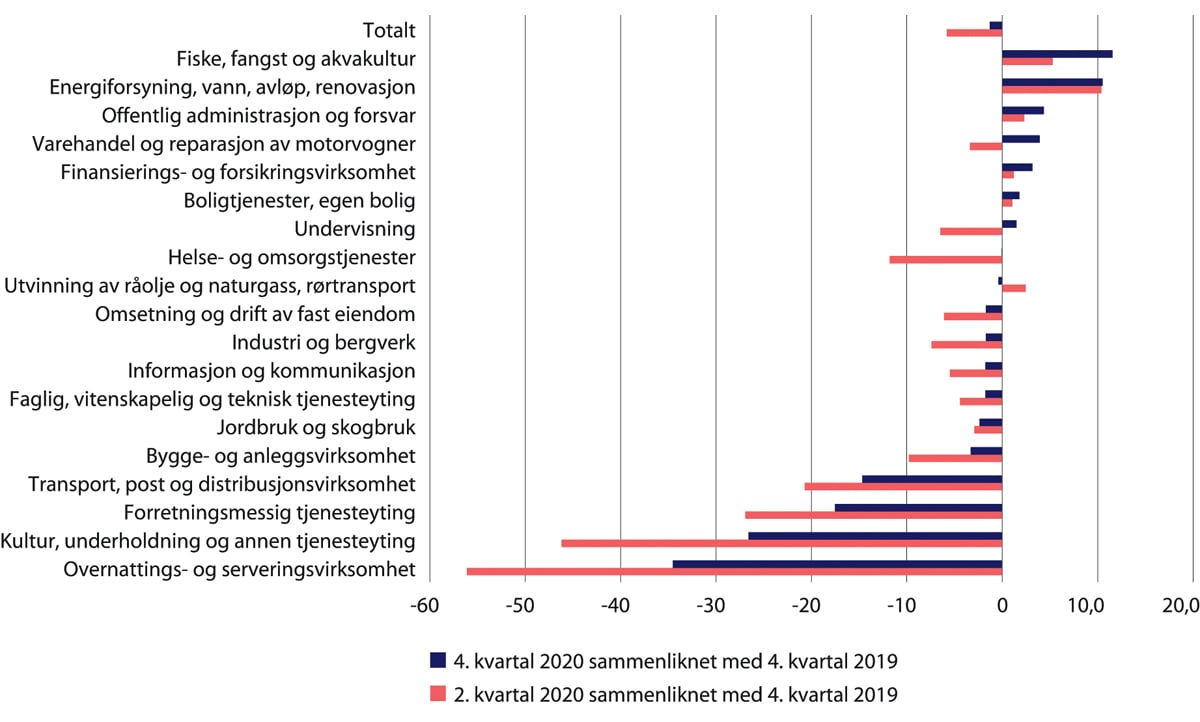 Overnattings- og serveringsvirksomhet er den næringen som hadde den kraftigste tilbakegangen i 2020. I første halvår ble verdiskapingen (bruttoproduktet) mer enn halvert. I likhet med i andre næringer tok aktiviteten seg opp i andre halvår, men verdiskapingen i næringen var likevel 34 prosent lavere i fjerde kvartal 2020 enn i fjerde kvartal 2019.