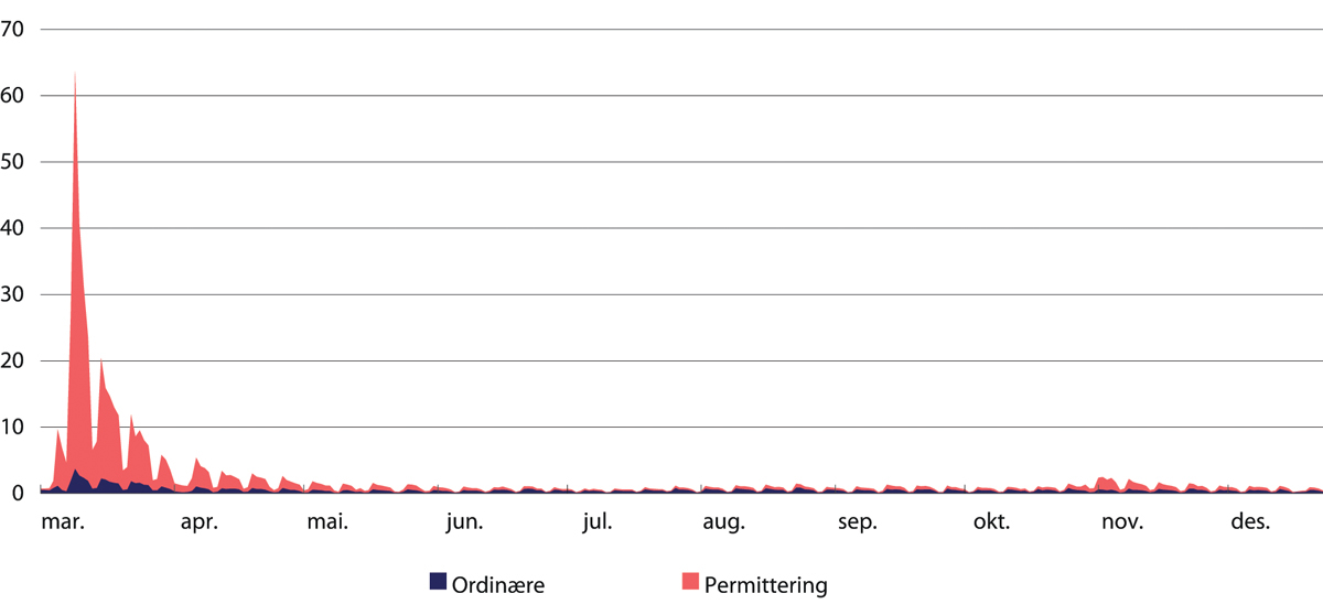 Ni av ti søknader kom fra personer som var permittert. Det vi si at de fortsatt hadde et arbeidsforhold som de kunne ha håp om å komme tilbake til. Det var likevel også et høyt antall nye ordinære dagpengesøkere.