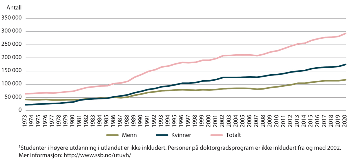 De siste års høye søkertall er en del av en lang utvikling. Siden 1973 har antallet studenter i universitet- og høyskoleutdanning økt fra ca. 64 000 i 1973 til over 300 000 i 2021.8