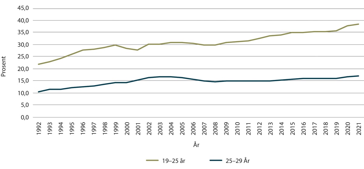 Figur 1.3 Andel mellom 19 og 29 år som studerer ved universiteter eller høyskoler. 1992–2021