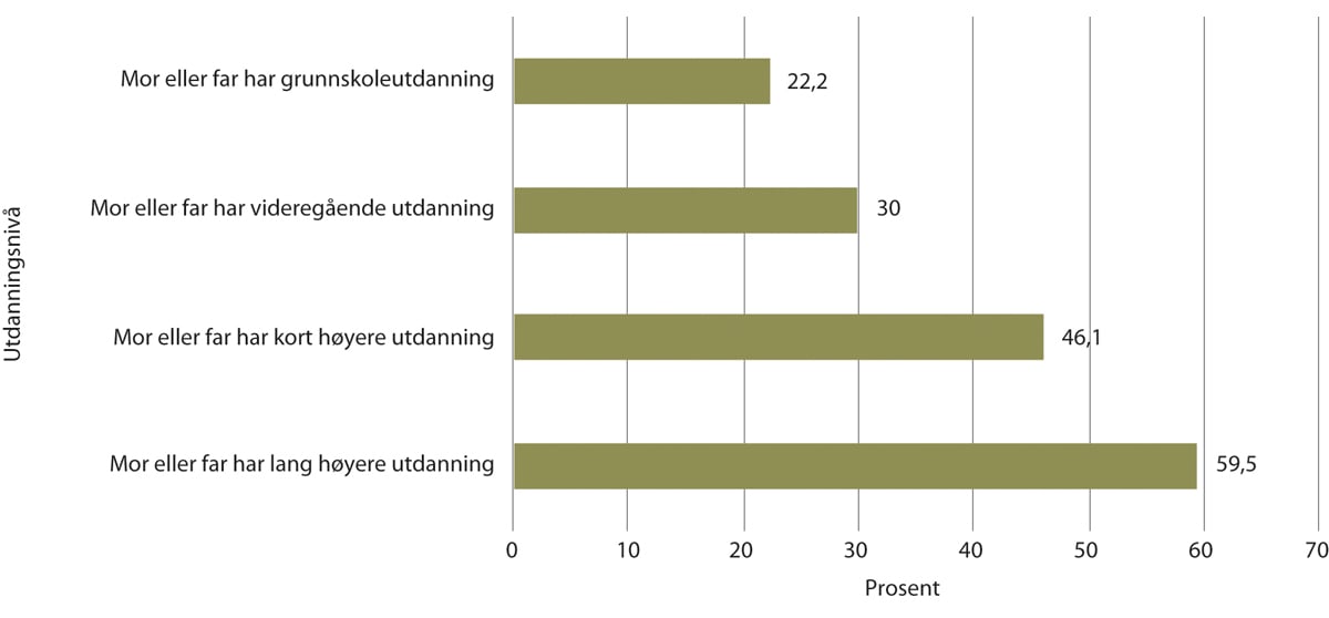 Studietilbøyeligheten fordeler seg ikke likt mellom unge med ulik sosial bakgrunn. Det fører til ubalanser i søkergruppa som opptaksregelverket grunnleggende sett kan gjøre lite med. Utdanningsvalg påvirkes direkte av hva slags familie ungdom er vokst opp i. Til tross for at alle i utgangspunktet skal ha like muligheter til å ta høyere utdanning, er studietilbøyeligheten høyest blant studenter som har foreldre med høyere utdanning. Figur 1.4 viser at av personer i alderen 19–24 år som har foreldre med lang høyere utdanning, er 59,5 prosent studenter ved et universitet eller en høyskole. Til sammenligning er det bare 22 prosent av dem som har foreldre med grunnskole som høyeste utdanning, som studerer ved et universitet eller en høyskole. Det er også flere jenter enn gutter som velger å studere.