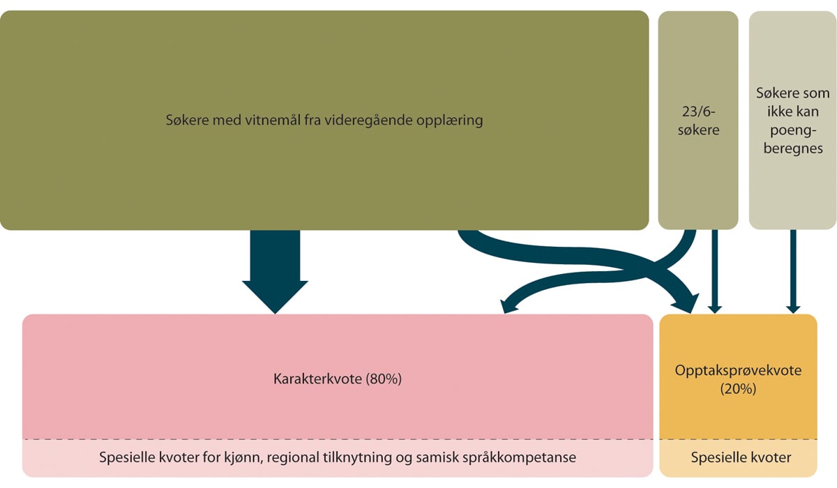 Søkere til høyere utdanning konkurrerer enten i ordinær kvote eller i førstegangsvitnemålskvoten. I tillegg har enkelte læresteder fått godkjent spesielle kvoter basert på regional tilhørighet eller andre spesielle kriterier for noen av sine studier. Felles for begge kvoter er at de hovedsakelig baserer seg på karakterer fra videregående opplæring. I en internasjonal kontekst er det norske opptakssystemet svært karakterbasert.