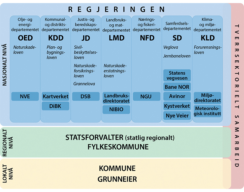 Sektoransvaret for håndtering av kvikkleirerisiko er fordelt på flere departementer (figur 5.1). Olje- og energidepartementet har det statlige forvaltningsansvaret for flom og skred, og er ansvarlig departement for forvaltning av landets vannressurser. Justis- og beredskapsdepartementet har ansvar for samfunnssikkerhet og beredskap. Kommunal- og distriktsdepartementet er overordnet plan- og bygningsmyndighet og sektordepartement for kommunene og fylkeskommunene. Kommunal- og distriktsdepartementet har også overordnet ansvar for statsforvalterne, som blant annet innebærer ansvar for å samordne andre departementers oppdrag overfor disse. Departementet gir også egne oppdrag til statsforvalterne innenfor kommuneøkonomi, areal- og samfunnsplanlegging og byggesak.