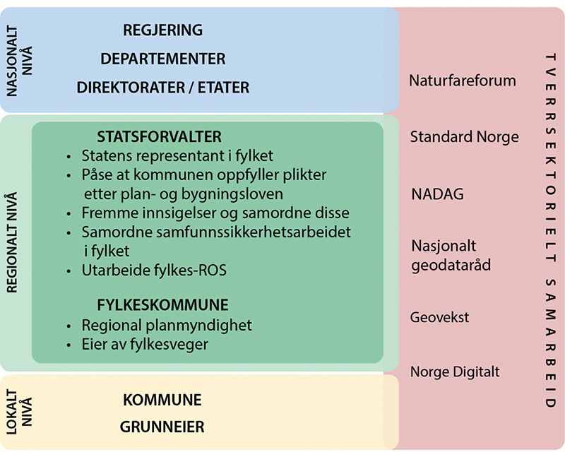 Kartverket har ansvar for forvaltning av nasjonale kartdata og geografisk informasjon, og er underlagt Kommunal- og distriktsdepartementet. Kartverket forvalter den nasjonale høydemodellen som gir detaljert kunnskap om terrengforhold, og som blant annet brukes til skredanalyser i samfunnssikkerhets- og beredskapsplanleggingen (Kartverket, 2022). Kartverket koordinerer også Norge digitalt-samarbeidet og Geovekst, som er nærmere omtalt i kapittel 6.5.2.