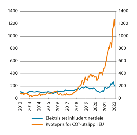 Prisene på elektrisitet inkludert nettleie steg markert fra 2020 til 2021. I fjorårets fem siste måneder var prisene høyere enn noen gang tidligere målt i KPI. Tolvmånedersveksten varierte fra 18,9 prosent i januar til 123,5 prosent i november. Etter en nedgang på 29,4 prosent fra 2019 til 2020 var årsgjennomsnittet for prisene på elektrisitet inkludert nettleie 70,8 prosent høyere i 2021 enn i 2020. Tolvmånedersveksten var 8,9 prosent i februar 2022. Den midlertidige stønadsordningen for husholdninger som følge av ekstraordinære strømutgifter bidro til å dempe prisene norske konsumenter betalte for elektrisitet i desember i fjor. En forsterket ordning gjelder også for 1. kvartal i år. Regjeringen har varslet at ordningen skal forlenges ut mars 2023, se boks 3.1.
